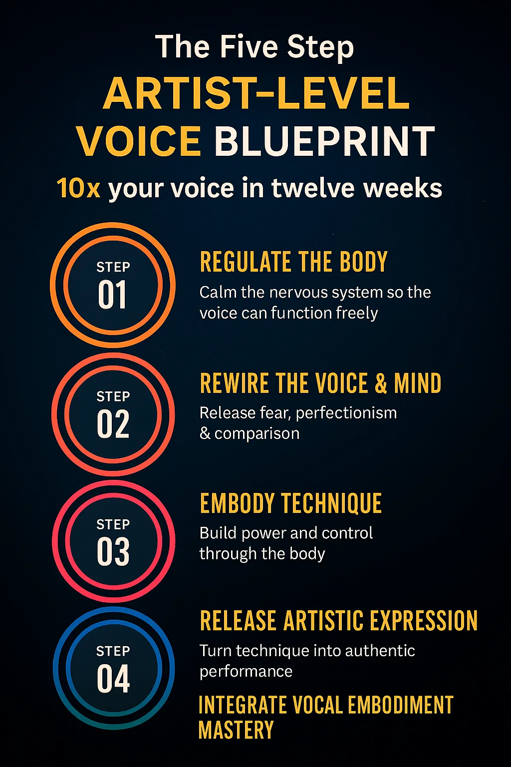 Today, she’s helped hundreds of singers and recording artists eliminate vocal strain, fatigue, and burnout while finally unlocking the authentic, artist-level sound they’ve been searching for.